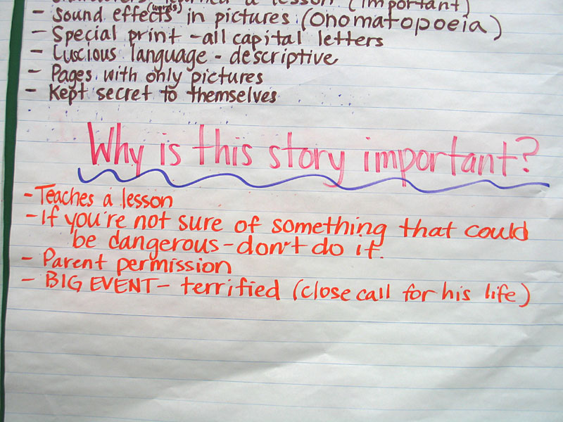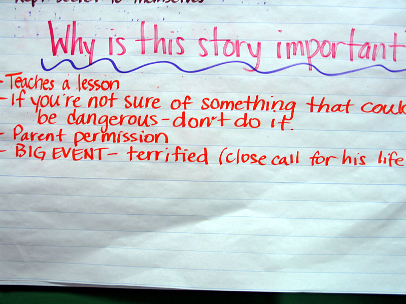 We selected a topic yesterday and in our closing yesterday you told me those topics. So I'd like you to put that topic back in your mind right now because we're going to be thinking a lot about that today. Today we're going to ask ourselves the question though, why? Why is that event important to us? You have the event in your minds. Why? Why was that event important? Why was it an event that you wanted other people to know about? We'll have a chance to share in just a second but I want you to think back, because we've done this work already. With our book, Whistling [by Elizabeth Partridge] and Shortcut [by Donald Crews], in Reader's Workshop, when we read those books, after we read them a couple of times and we had gone though some of the events that we had found, some of the narrative elements that we had found, we asked ourselves the question, why? Why was this book written, why did the author spend time working hard on it?, and we came up with some ideas. Now the theme that I remember some of you telling me was that, well, you thought that it might be because in Whistling, we said that maybe she had had that experience with her dad, maybe she had gone out into the woods and whistled, but we weren't sure because we weren't the author. But today you are the author. You are the one that gets to determine, why is it important, why is it a story that needs to be told? So still be thinking about that. Why, why was it important? One of the stories, if you remember, that I told you was when I jumped into the swimming pool and I turned around as I was coming down and I'd split my chin a bit. Remember I had to go to the hospital and I had to get stitches. Well, that was the story that I decided needed to be told so that's the story that I selected or the brief that I selected yesterday. So I asked myself this question. Why was this event, of jumping into the swimming pool and splitting my chin open, why was it important to me? Why did I need to tell the story? |