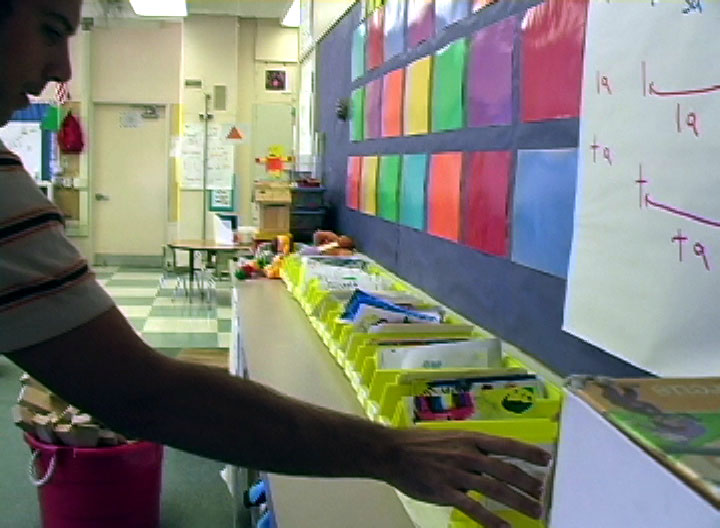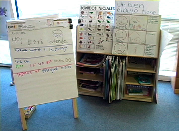 Today we're going to select a book to put there on the wall. Our favorite book, ok? The most excellent book. Ok? The most excellent book that we have. So, now I'm going to teach you how you're going to pick you're books, and how you're going to decide which is your favorite book. Ok? Here I have my folder. Right? Here is my folder. But here I only have one book, the book I'm working on. The book I haven't finished yet, right? So, what I have to do is go and collect my books from my yellow box. And for today, I'm going to use Maria's yellow box for Teacher Limón. Here I have my books. All the books that I've done. And I'm going to get all of them, all the books and bring them here, and we're going to imagine that this is my desk. Ok? I'll sit down here. |