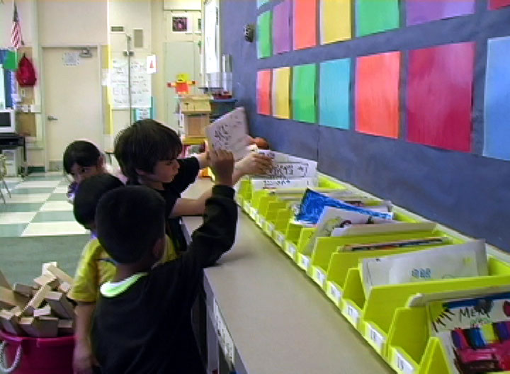 I think it's interesting to see here how kindergarten students need help simply moving from place to place in the room. Some of the students are confused about where to go and need my guidance to help them. I also purposely dismissed them to the tables by their color groups to avoid a big traffic jam at the book boxes.